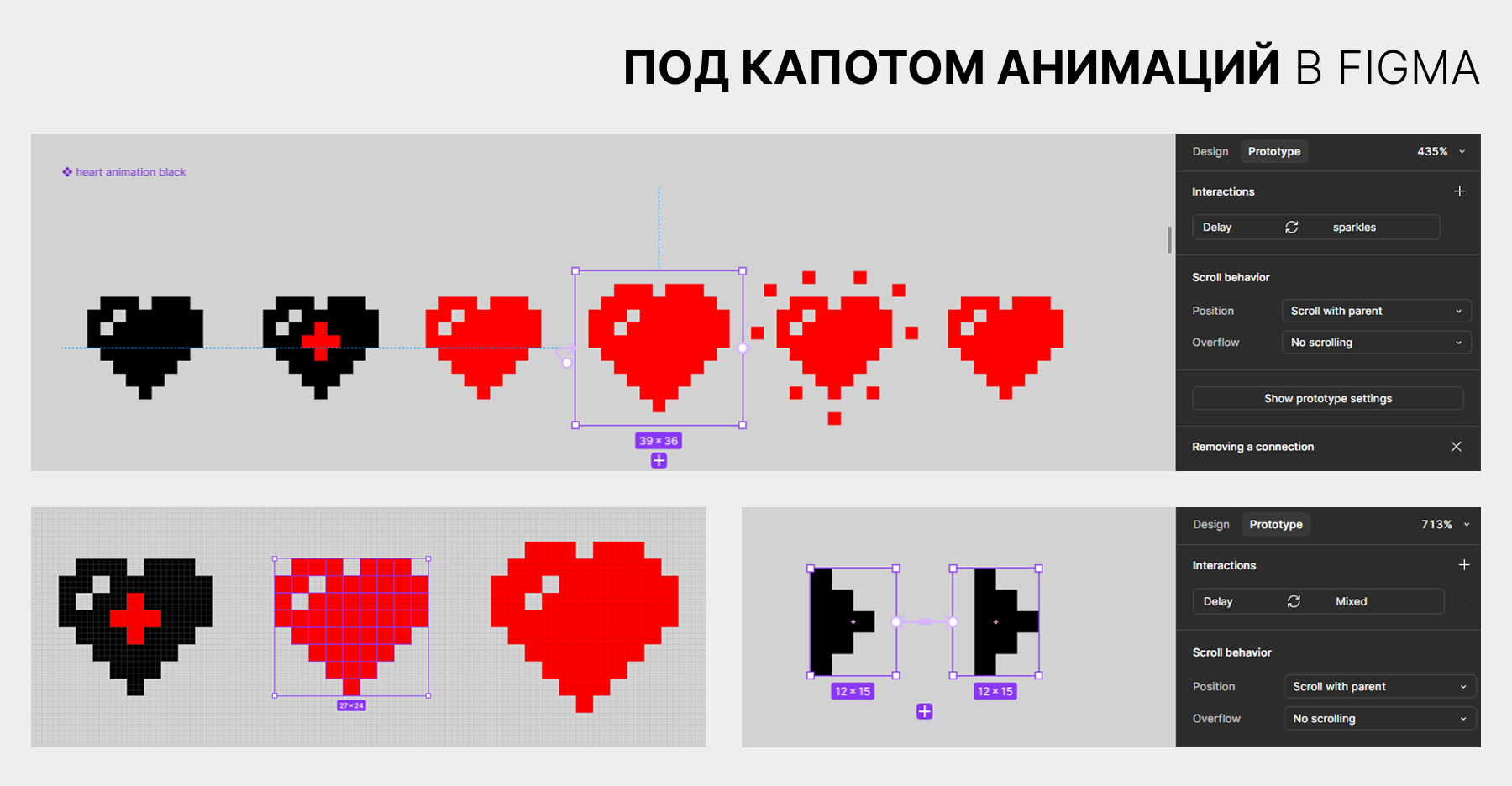 Пиксельные ретро-анимации собраны в Figma из простейших квадратиков и анимированы при помощи прототипирования.