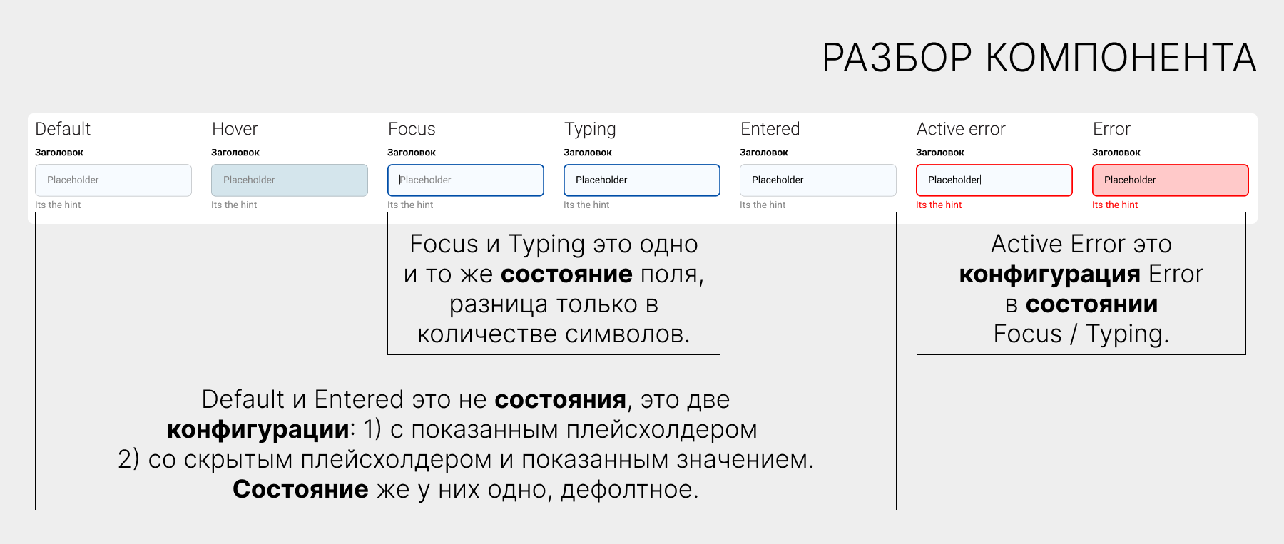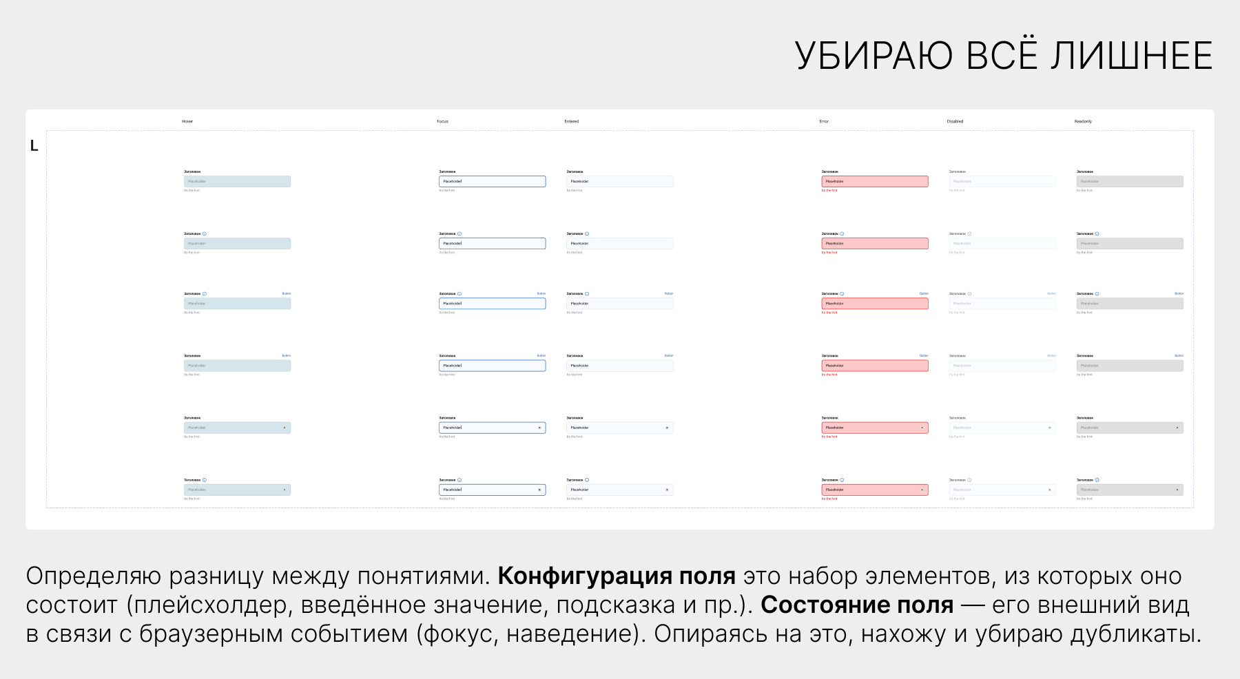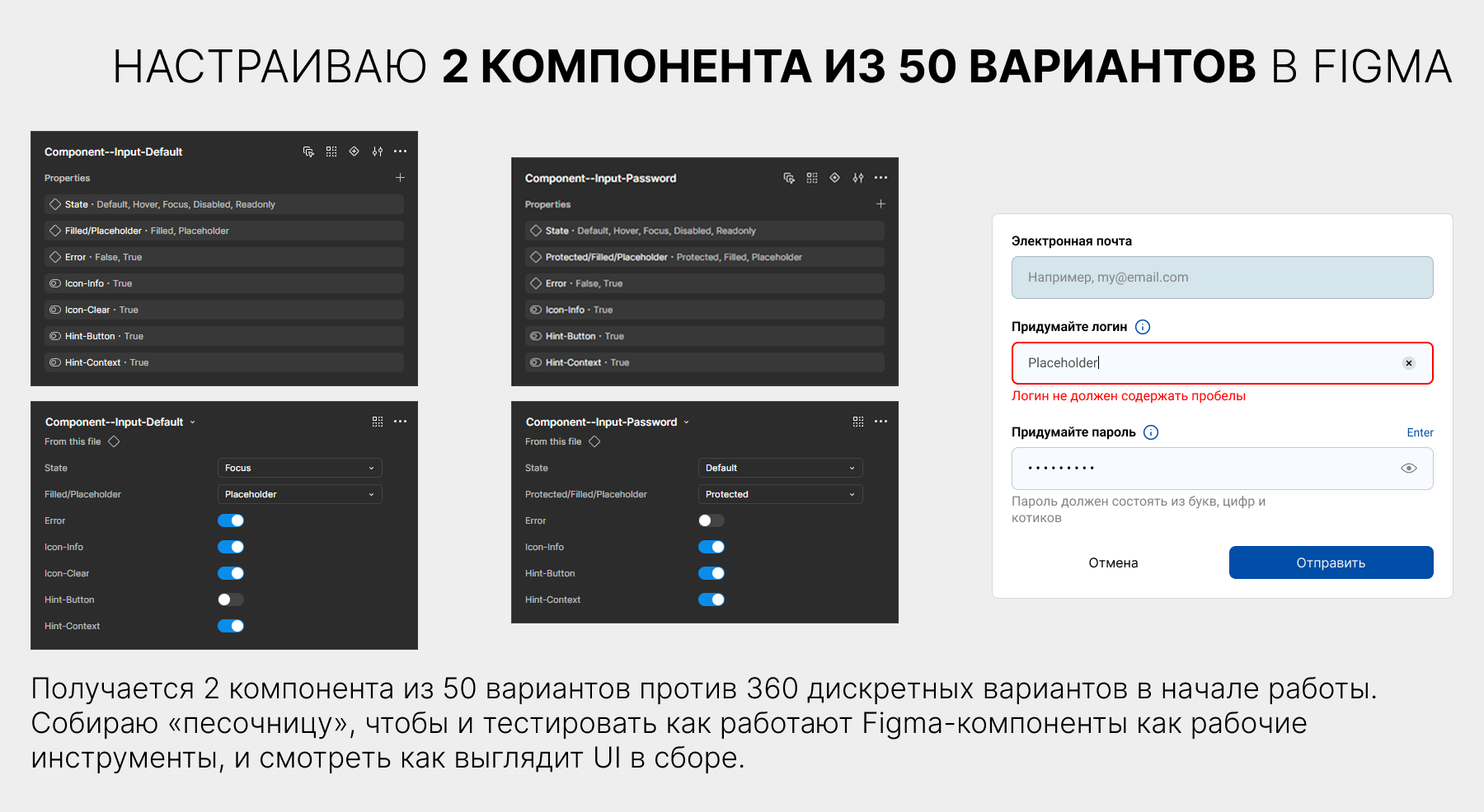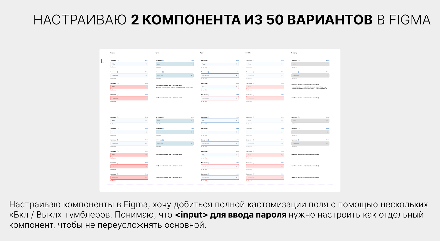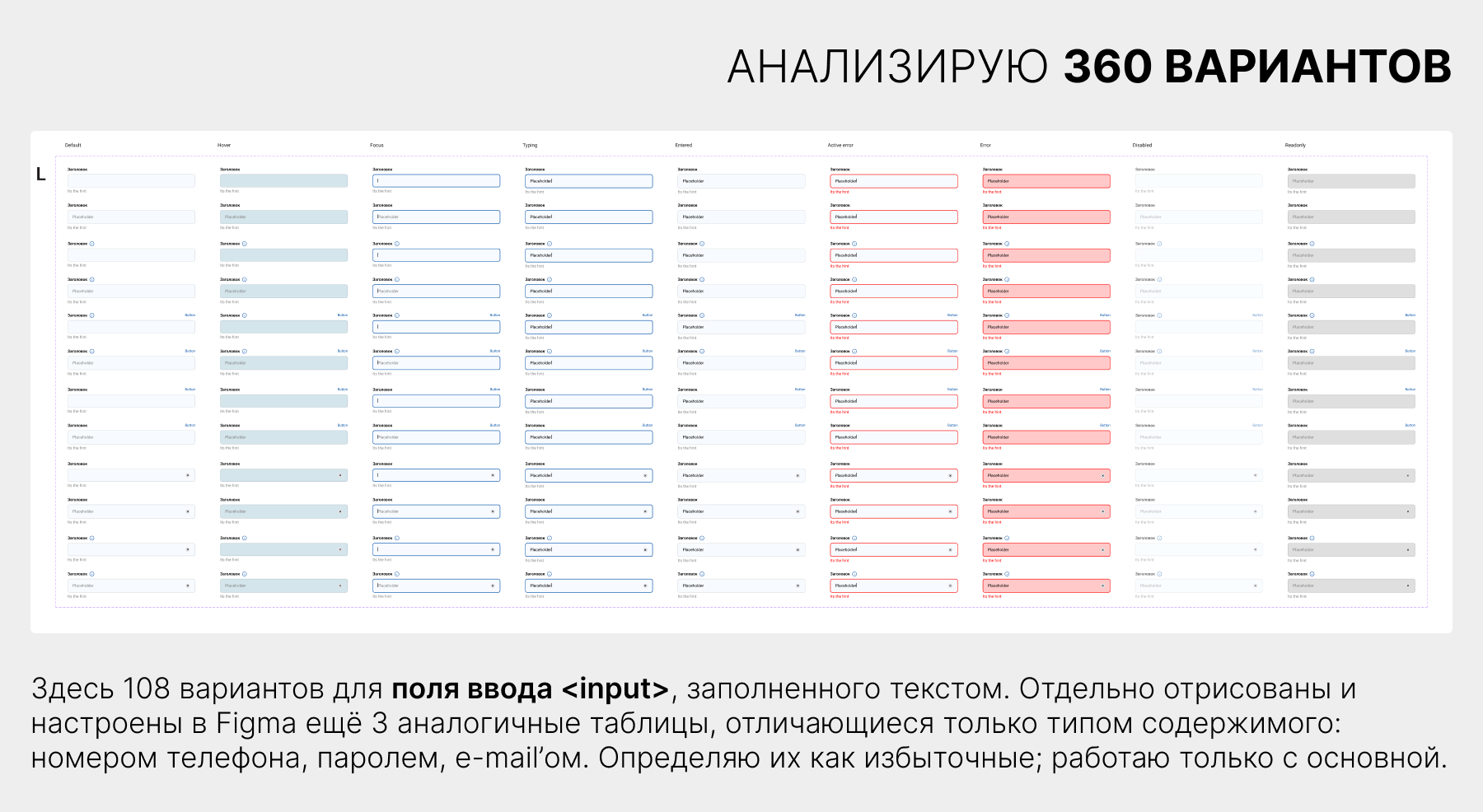 Ответ на заданный выше вопрос: да. Дизайнеры начали работу от частного к общему и углубились в разработку одного компонента — поля ввода <input> — пытаясь предусмотреть все возможные варианты. К моменту, когда компонент попал ко мне на ревью, было отрисовано 360 различных вариантов поля ввода, при этом автоматизация через ассеты в Figma не была полностью настроена. Я отметила это как точку роста, которую важно подсветить комманде: использовать такую громоздкую конструкцию как основу для создания трёх визуально разных направлений будет почти невозможно.