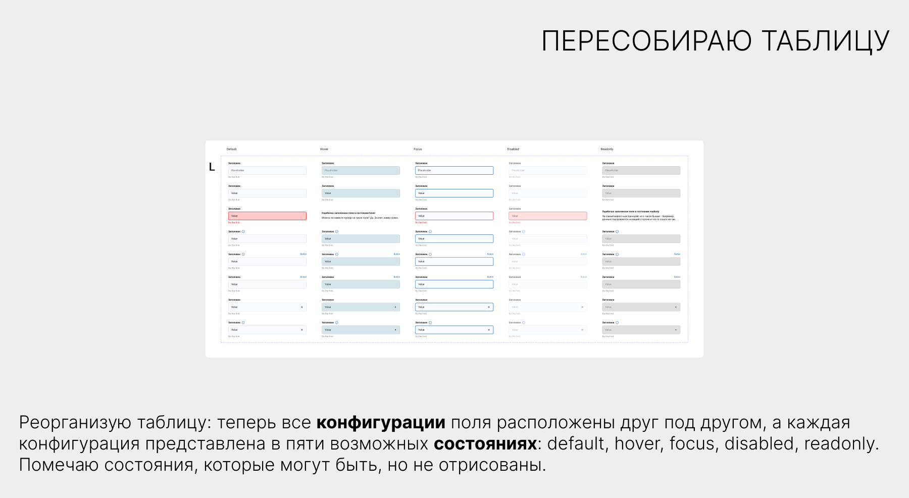 Кроме того, стало понятно, что для многих в команде это первая работа с дизайн-системой. Вместо того чтобы выстраивать процессы, они копировали подходы крупных корпораций, что усложняло задачу.