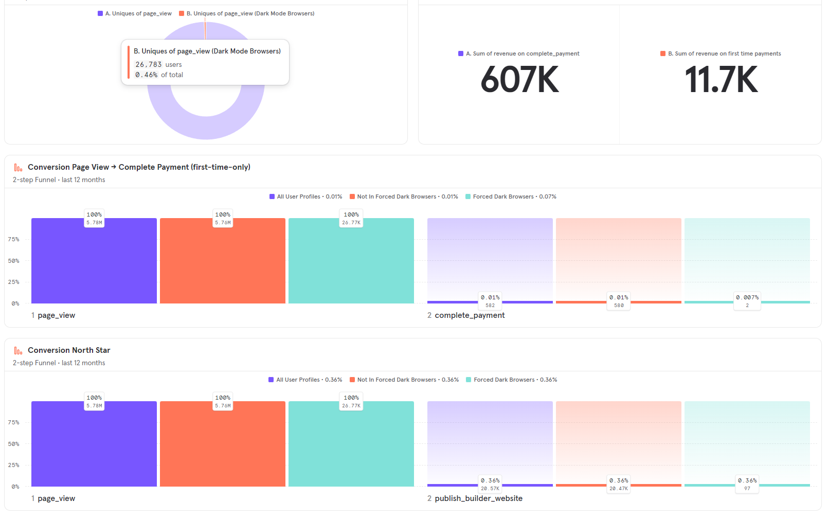 За последние 12 месяцев в группе Forced Dark Browsers было всего 2 оплаты, конверсия составила 0,007% против конверсии 0,01% в контрольной группе.