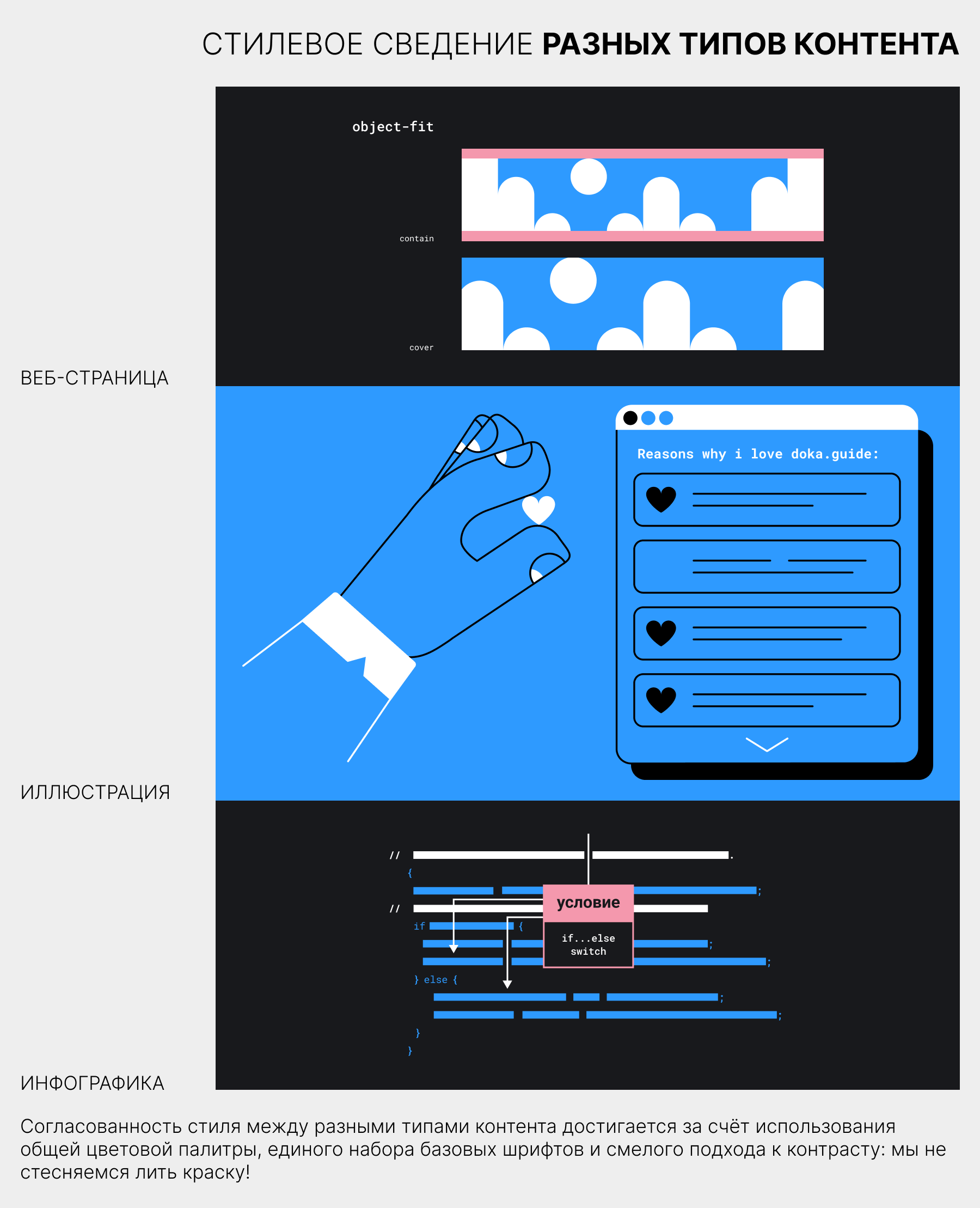 упаковать выбранный стиль в дизайн-систему, с помощью которой авторы смогут самостоятельно создавать графику и примеры с минимальным участием дизайнеров;
