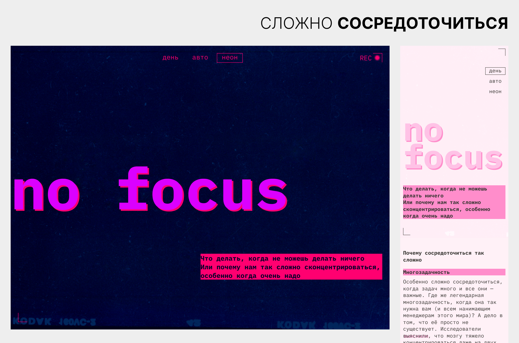 Также я поставила перед собой личную цель: сделать дизайны максимально разными, от привычного лендинга с красивыми картинками до обскурного панка, который, на первый взгляд нарушает все правила, но, на самом деле, следует им.