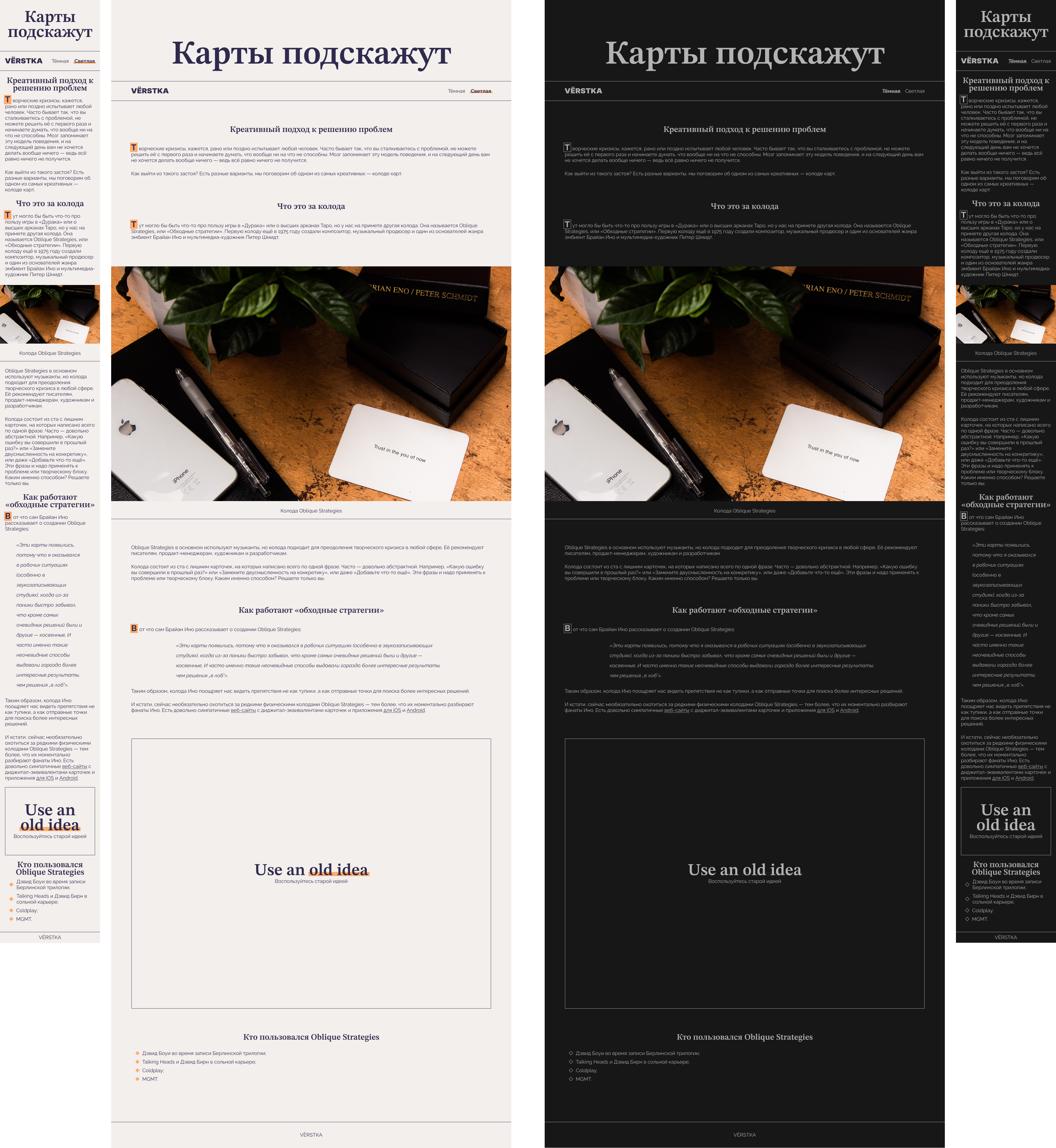 На подготовительном этапе я нарабатывала визуальную базу, оформляя веб-страницы одну за другой. Миновать этот этап было невозможно — тексты и примеры были разрознены по личным аккаунтам авторов, а весь контент хранился только в виде кода в репозитории на GitHub.