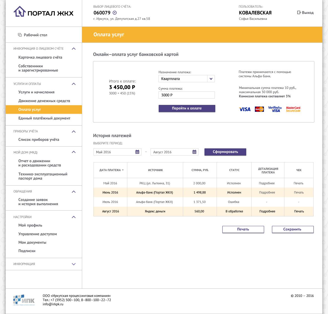 На странице оплаты, помимо самой формы оплаты, требовалось так же представить историю платежей в табличном виде. Таблица, тянущаяся вширь, определила и дизайн формы оплаты, поэтому я разместила информацию о сумме к оплате и комиссии слева и справа от формы.