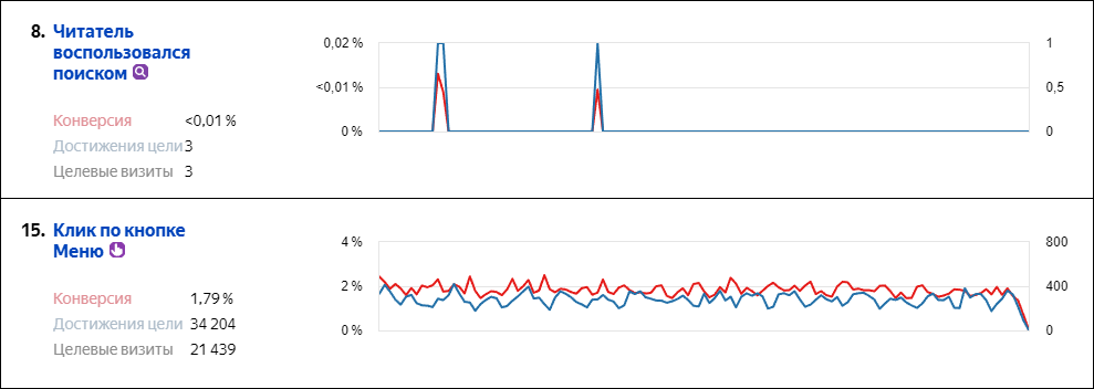 Кроме того, «всплывающий» поиск можно активировать не только кликом по кнопке, но и нажатием на горячую клавишу / на клавиатуре. Эти сценарии не фиксировались в Яндекс.Метрике, что делало цель «Клик по кнопке Меню» неполной и не отражающей реальное использование поиска.