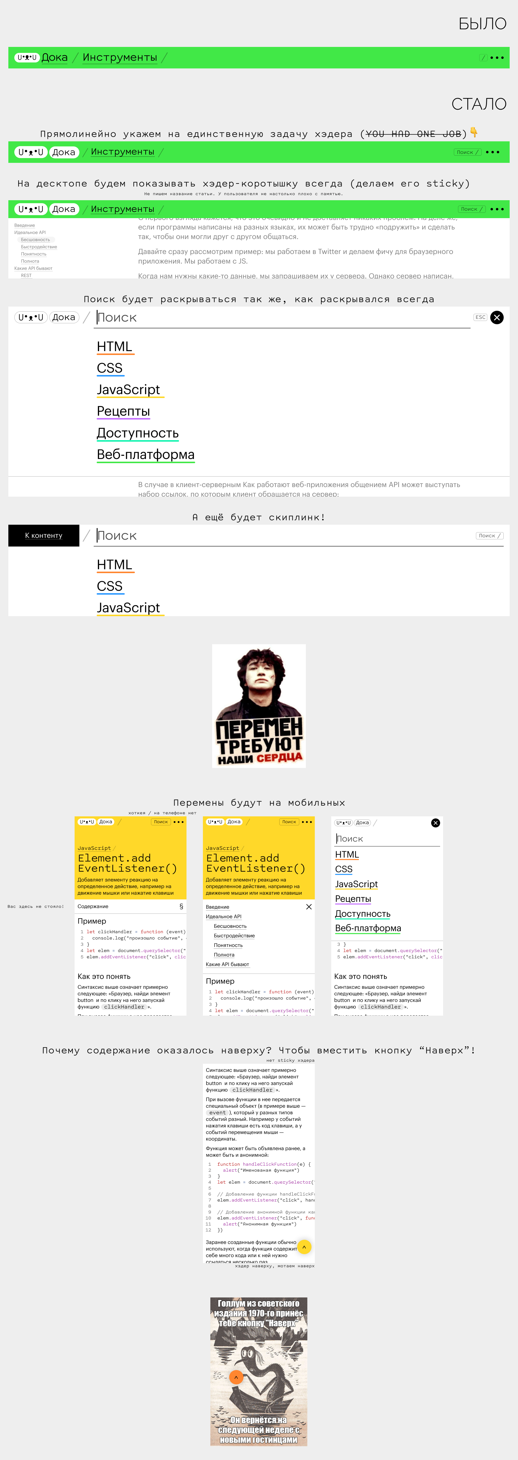 Исправления во фронтенде необходимы уже сейчас для подготовки предстоящего редизайна сайта, потому что при редизайне нужно будет обеспечить корректное отображение накопленного за годы контента, а эти небольшие фиксы — это шанс обкатать решения.